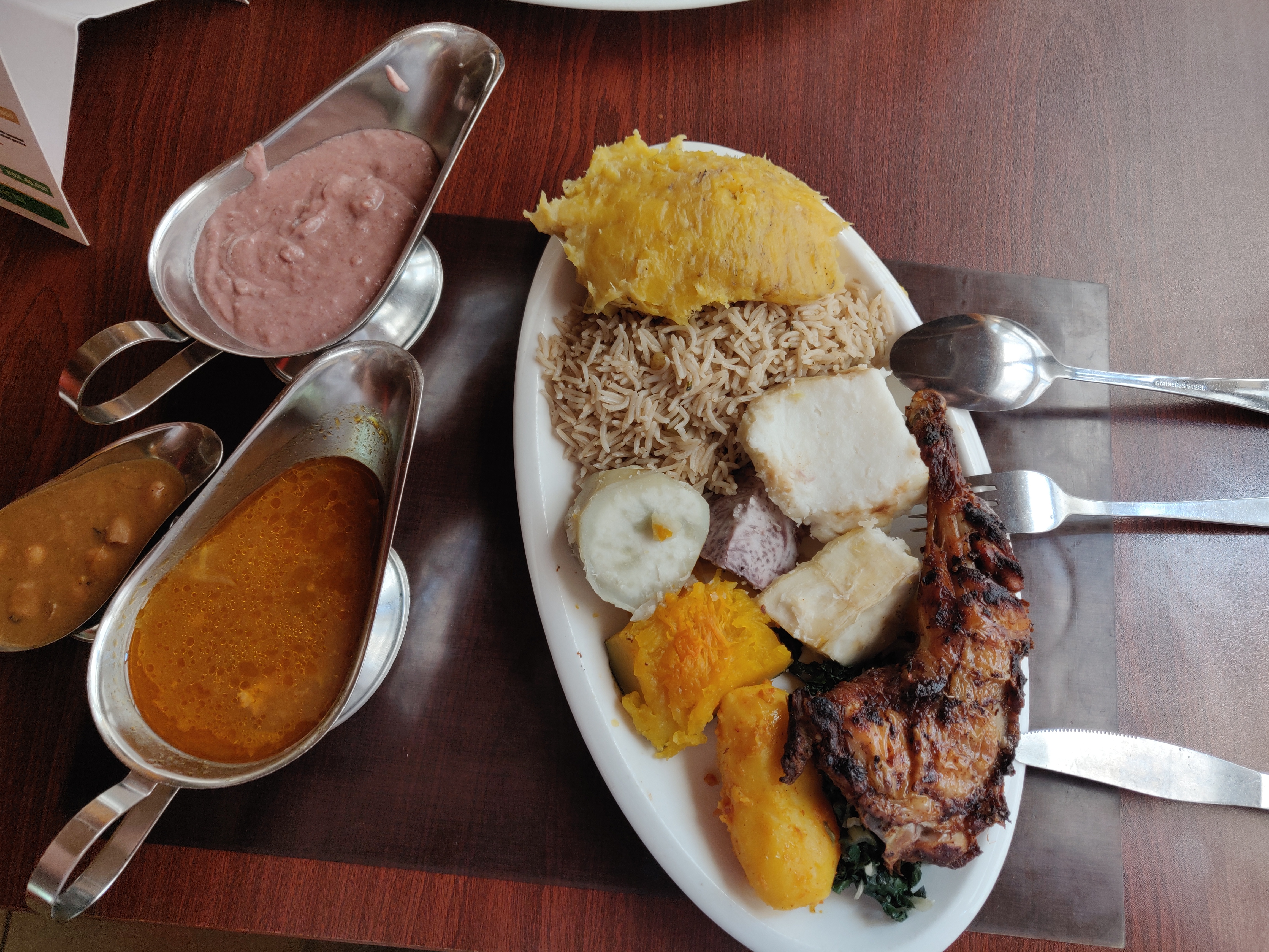 Bei trumpai apie maistą. Nacionalinis Ugandos patiekalas yra matoke – tai tušinti žali bananai, kurie paruošus skanaujasi kaip bananų konsistencijos bulvių košės skonio patiekalas. Taip pat prie pagardų populiaru posha, tvirtos konsistencijos kukurūzų miltų košė. Kaip pagrindinis eina vištienos ar jautienos troškinys (visgi reti reikalai) ir daug dažniau pasitaikantys pupelių troškiniai/marmaliukai ir kepintų lazdyno riešutų padažas (violetinis).