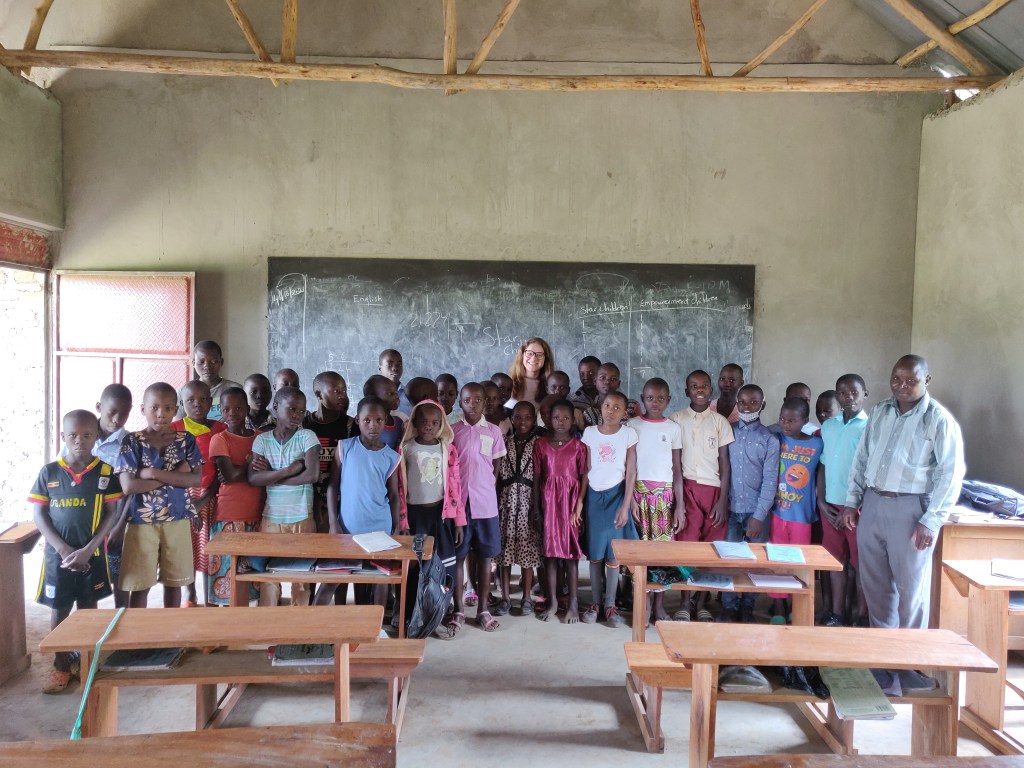 Bendra informacija apie Ugandą: dėl pandemijos jau beveik 1,5m. mokyklos yra uždarytos, tačiau šioje stovykloje, kuri yra maždaug vidury niekur, vaikai susirenka kelioms valandoms per dieną ir dirba su mokytojais. Mano pirmoji pamoka buvo apie pasaulio žemynus bei žinoma – Lietuvą. Jos metu vieną klasę išmokiau pasakyti LABAS, AKI (mat ištarti pilną vardą iš pirmo karto vietiniams sunku). Dabar ir prasilenkiant ne tik klasėje dažnai išgirstu LABAS, AKVILA. Vėliau prisidėjo ir matematikos mokymas. Teko pačiai prisiminti daugybas ir dalybas stulpeliu. Taip pat du kartus per savaitę dirbu su mergaičių grupe, kurioms padedu mokytis skaityti angliškai. Keli momentai iš pamokų: